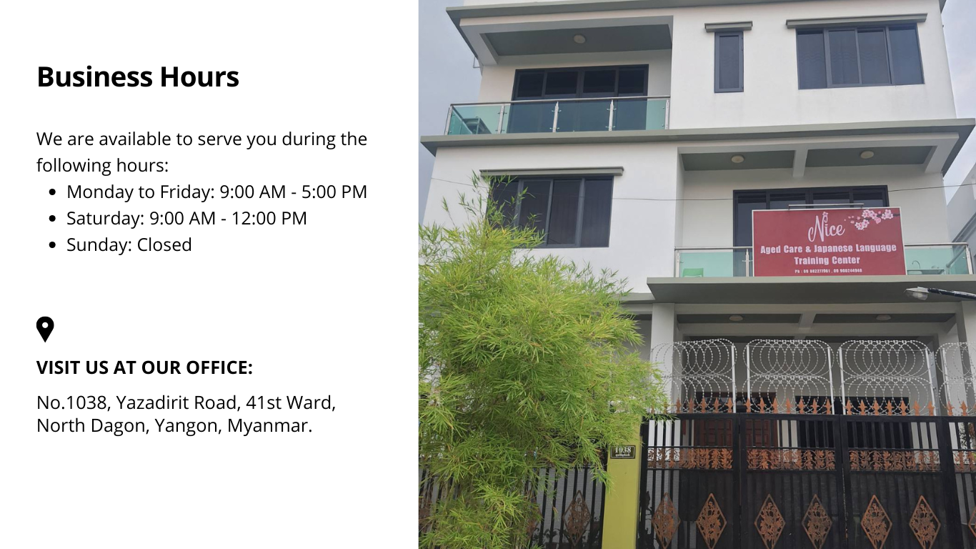 You can reach us via phone at +95 9 882 277 961 or +95 9 960 244 940, email us at [email protected], or visit our office at No.1038, Yazadirit Road, 41st Ward, North Dagon, Yangon, Myanmar.